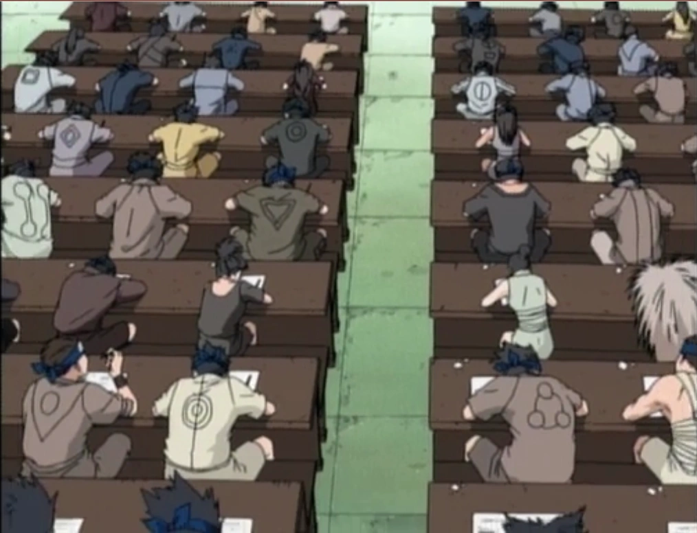 - Los exámenes Chūnin: Tras pasar algún tiempo y adquirir algo de experiencia en combate, llegan los exámenes para Chūnin. Estos constan de varias pruebas que miden la capacidad de respuesta de los Genin ante situaciones imprevistas. La primera de ellas es una prueba escrita con preguntas muy difíciles de responder por lo que los alumnos se ven obligados a copiar utilizando distintas habilidades ninja que les ayuden a recabar información. Tras las primeras 9 preguntas se les entrega a los alumnos la 10ª pregunta tras establecer que si se les ve copiando en el examen se quedarían como Genin para toda la vida o a cambio podrían salir del aula y probar suerte al siguiente año. Esto resulta ser simplemente una estrategia para ver si los Genin se pondrían nerviosos ante esta situación y todos los que permanecen en la sala son automáticamente aprobados. El siguiente examen consta de la supervivencia en un bosque lleno de bestias donde cada equipo obtiene un pergamino de 2 posibles al azar y su objetivo es traer los dos distintos al centro del bosque con un límite de tiempo de tres días. Dentro del bosque el equipo 7 es atacado por Orochimaru y Sasuke recibe una marca maldita en su cuello durante la pelea. Al final, el equipo 7 consigue su objetivo en la prueba pese a los contratiempos y pasan a la última prueba. La última prueba consta de combates frente a público procedente de todas las aldeas en una eliminatoria donde se ve el potencial de cada participante pero poco antes de terminar los últimos combates la aldea se ve atacada por Orochimaru.